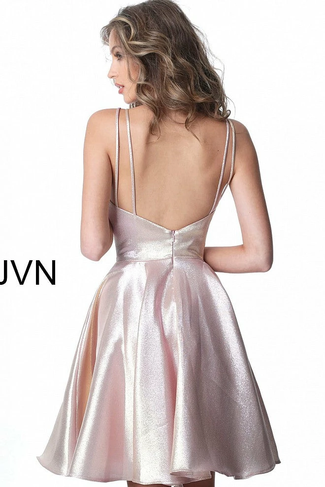 Jovani JVN 3780 Short Fit & Flare metallic shimmer Short Prom Dress and Homecoming Gown. criss cross strap V neckline. Has pockets! Spaghetti Straps. Great formal cocktail evening gown! JVN3780Â