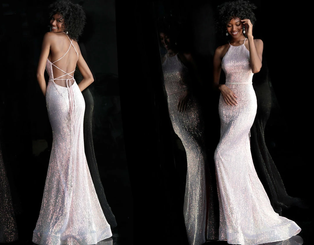 Details: Pink sequin embellished fitted prom dress with the high halter neckline, sleeveless fitted bodice and tie-up open back, embellished waist belt and floor-length fitted skirt.