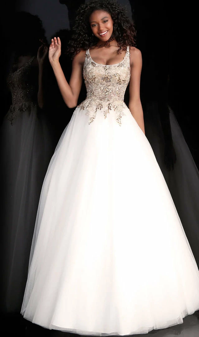 Jovani JVN67127 Gold Floral embroidered bodice accented with AB Crystal Rhinestones & Gold Sequins this sheer bodice is the icing on the cake. The lace up back flows into the lush tulle ballgown skirt. prom dress ballgown Prom Dress Pageant Gown. JVN 67127