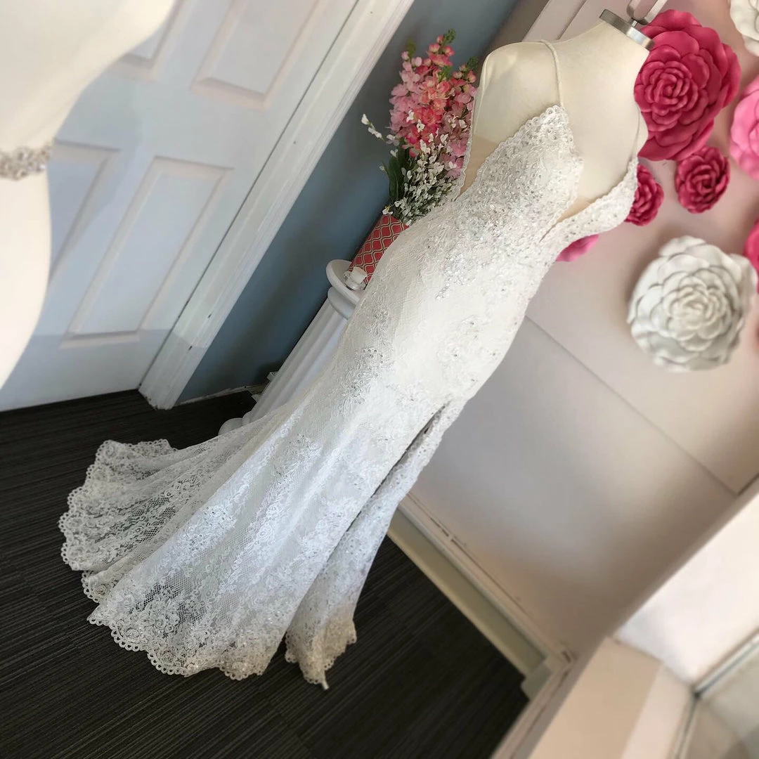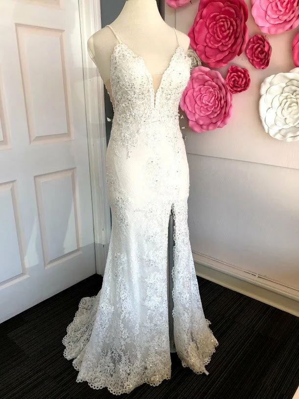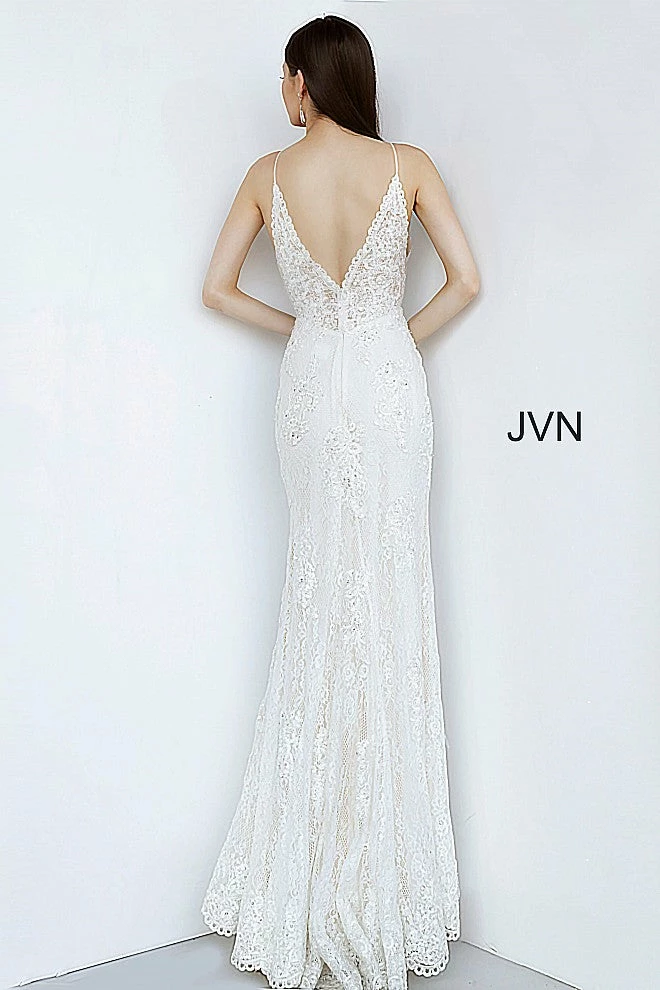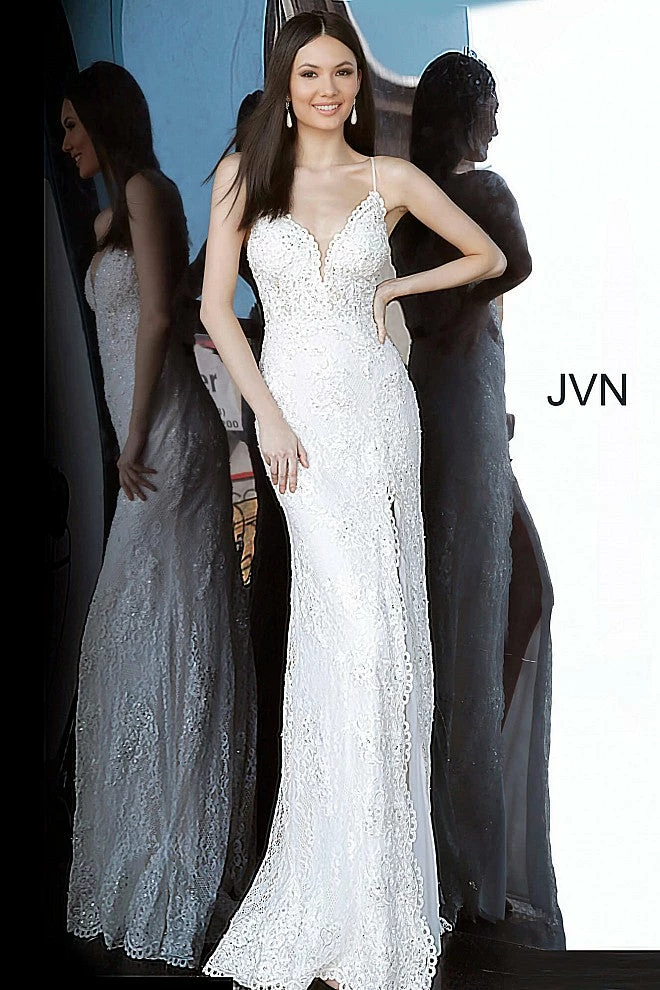 Jovani JVN00864 is an absolute stunner! Long Fitted Prom Dress or Unique Sexy Wedding Dress. Delicately Embellished Lace with a Plunging neckline & High Slit with scallop lace edges. Spaghetti straps with a slightly sheer lace bodice. JVN 00864