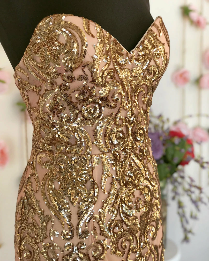 Jovani JVN00954 Is a Stunning Sequin Embellished Sweetheart Neckline Mermaid Silhouette Prom Dress. Detailed Tulle accents along the skirt are a nice touch on top of the Damask Print Sequin Bodice! Stunning Pageant gown.Â