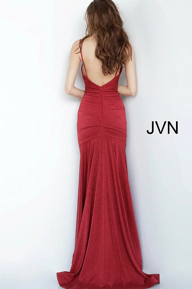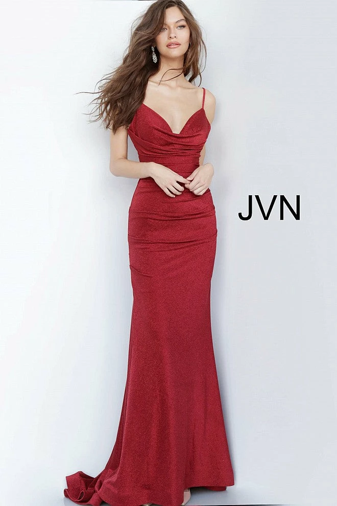 Jovani JVN00967 Burgundy Fitted Shimmer Long Prom Dress Ruched cowl neckline satin evening gown JVN00967 Formal Evening gown with glistening style & a sweeping train Fit & Flare