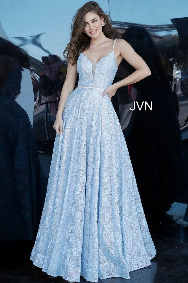 Jovani JVN03111 is a Long Metallic Lace Prom Dress with an Iridescent shimmer overlay fabric. Plunging neckline with a crystal embellished waistband and spaghetti straps. A line silhouette.Β Stunning Shimmering Wedding Dress in Ivory! Prom Dress, Pageant Gown, Formal a line dress. JVN 03111
