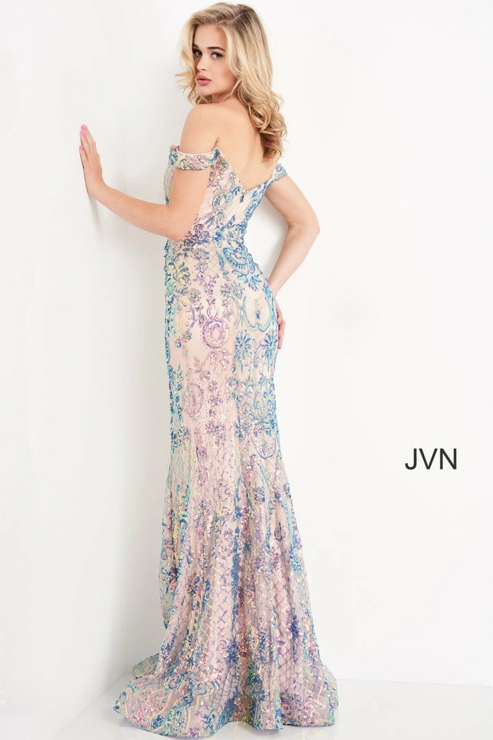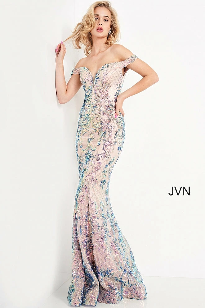 Jovani JVN04515 is an over the top 2021 Prom Formal Wear Style! This Glamorous Pageant Gown Features off the shoulder straps with a Plunging V Neckline. Fitted Mermaid Silhouette Cascades into a subtle lush trumpet skirt. Elaborate Multi Color Sequin Pattern form a damask print and add a Glamorous appeal. This gown is for those who want to be seen! Great for Plus Size! Great sexy wedding reception dress in ivory! JVN 04515
