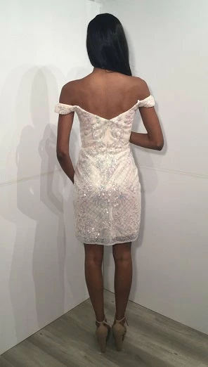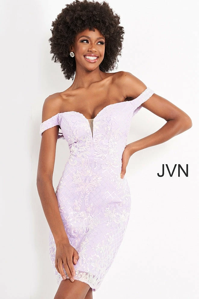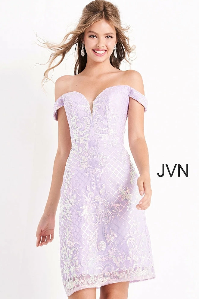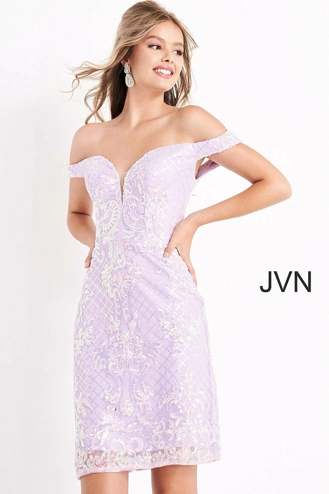 Jovani JVN05251 – JVN 05251 is a short fitted homecoming cocktail dress. Featuring a sweetheart off the shoulder neckline. This Fun Formal evening gown has a slightly plunging v neckline with mesh insert. Elaborate scroll sequin pattern with multi dimensional embellishments adds a pop to any event!