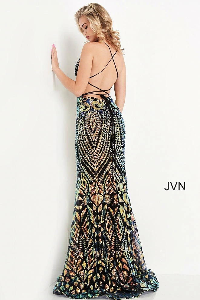 JVN05758 v neckline sequin fitted prom dress evening gown backless corset tie