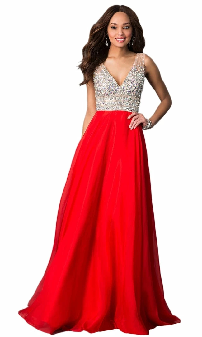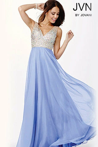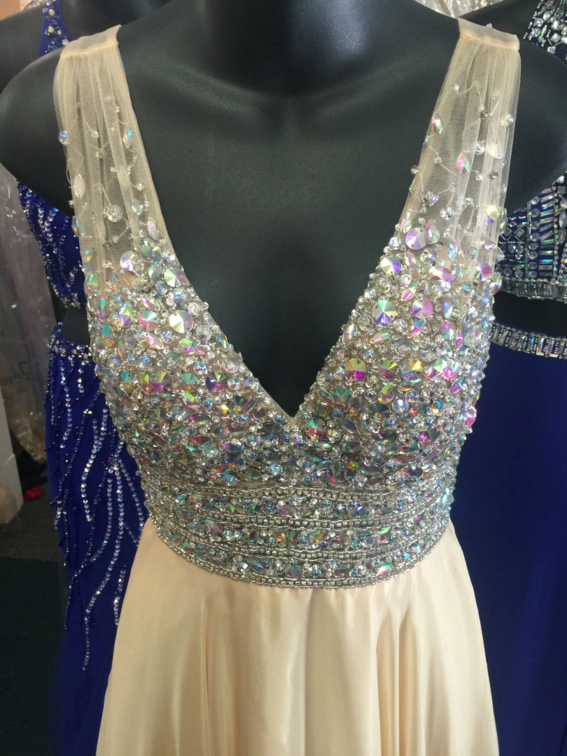 Jovani JVN20437 ο»ΏStunning chiffon flowy prom dress features sheer v neck beaded top. Makes a beautiful pageant gown.Β In stock in light yellow size 0.