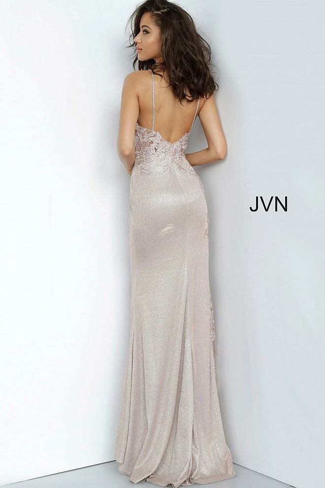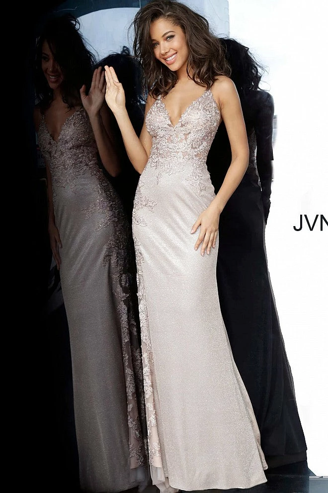 - Details: Glitter prom dress, form fitting silhouette, floor length skirt with sheer embroidered side panel, sheer floral embroidered bodice, bra cups, embellished spaghetti straps over shoulders, V neckline, open back