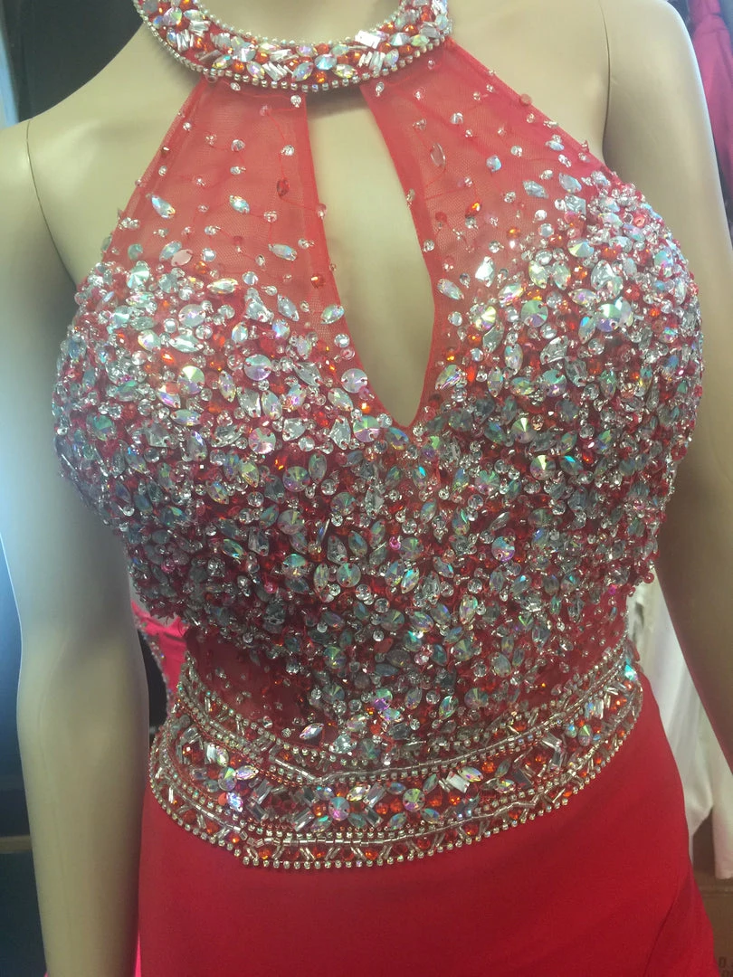 ο»ΏStunning halter form fitting dress features a sexy thigh high slit and crystal embellished bodice with a keyhole neckline