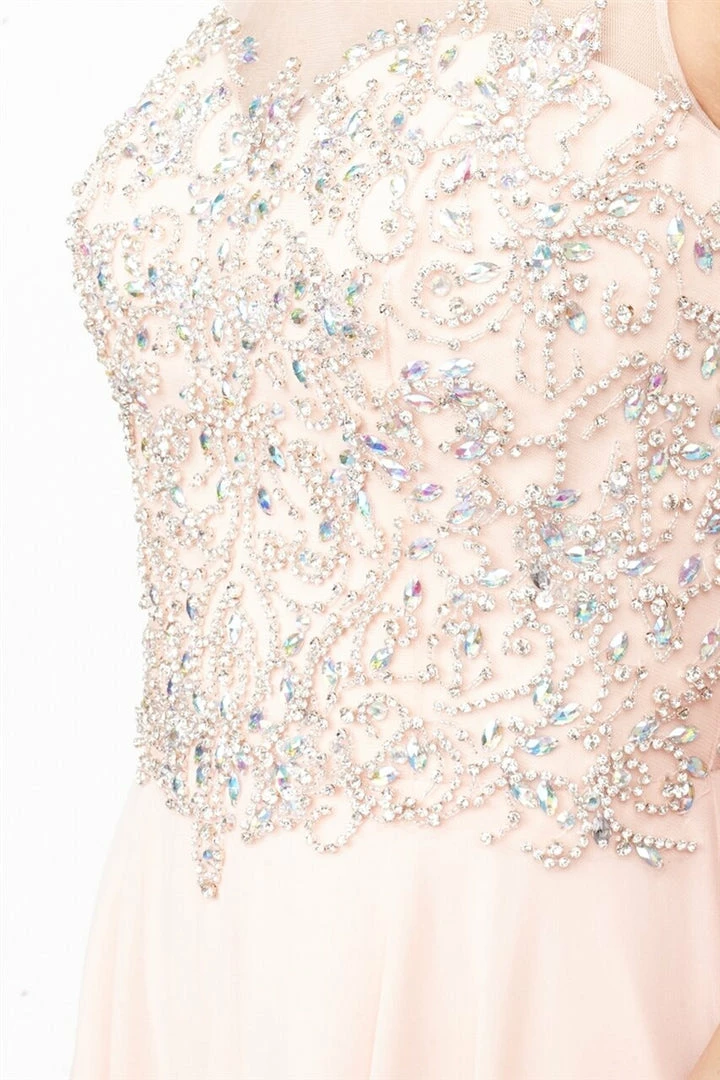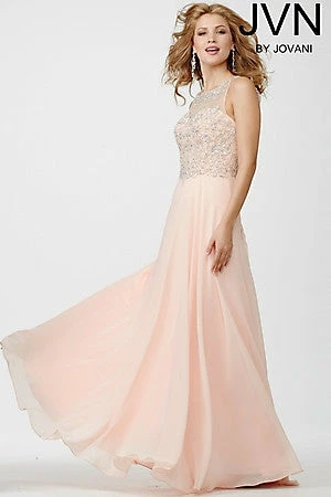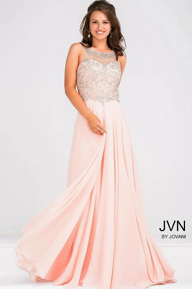 Jovani JVN27809 High Embellished Sheer Neckline with a illusion sweetheart. Thjis Evening Gown with illusion Keyhole Back and long flowy chiffon skirt pageant gown prom dress JVN27809