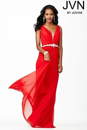 Beautiful sleeveless dress features a plunging neckline with sheer mesh panel and a crystal waistline adornments JVN31415