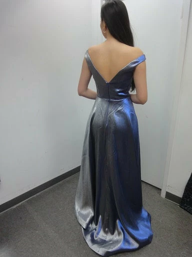 Jovani JVN3777 is a long iridescent Prom Dress, Pageant Gown & Formal Evening Wear. Metallic Shimmer Long Maxi Prom Dress. Off the Shoulder Straps with a V Neckline. High crossover slit all the way to the waist line.Â