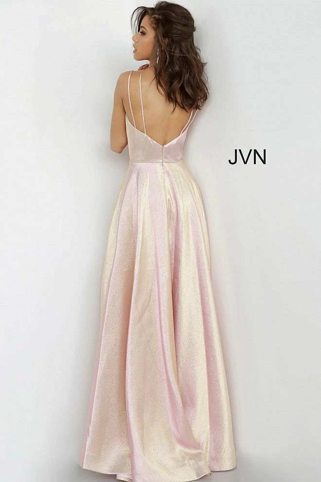 Jovani JVN3779 is a stunning shimmer A line Prom Dress. Featuring a Metallic Iridescent Shimmer Fabric. Deep V Neck with Criss Cross strap pattern. High Front slit goes all the way up to the waistline. Open Back Formal Evening Dress. Color Changing material with light variations. JVN 3779
