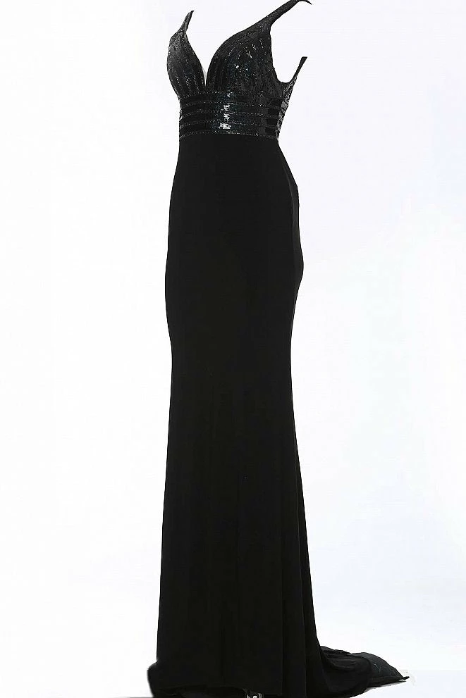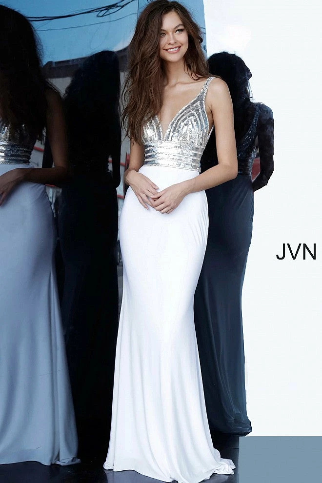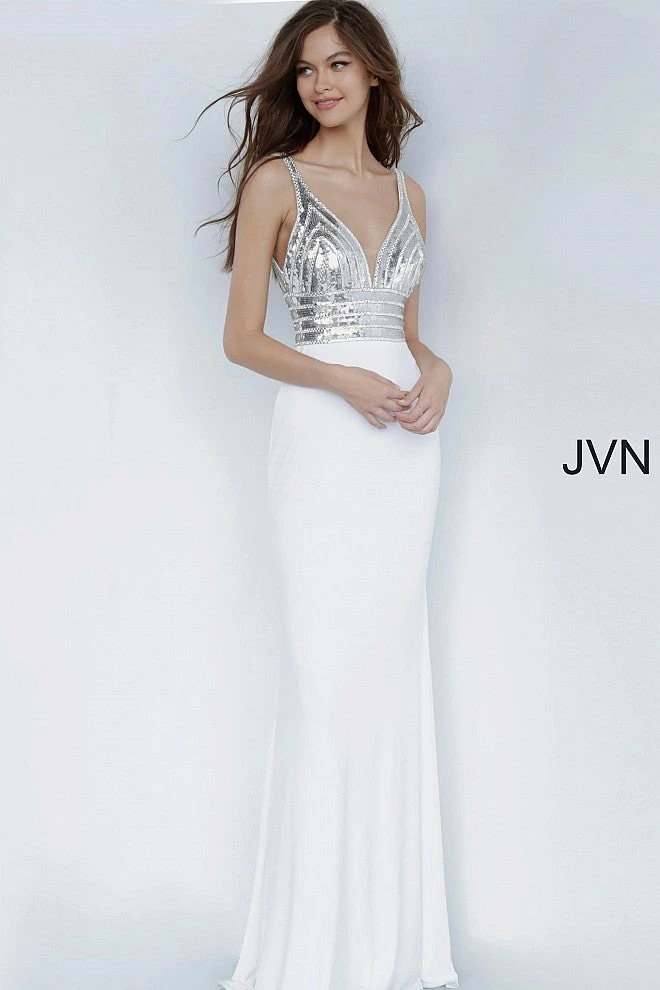 Jovani JVN4240 is a long fitted jersey Prom Dress. Featuring a Sequin embellishedΒ Bodice with a V neckline & midrise V Back. This dress will stretch and hug your curves. JVN by Jovani 4240 Perfect Prom Dress, Evening Gown or Pageant Dress.Β