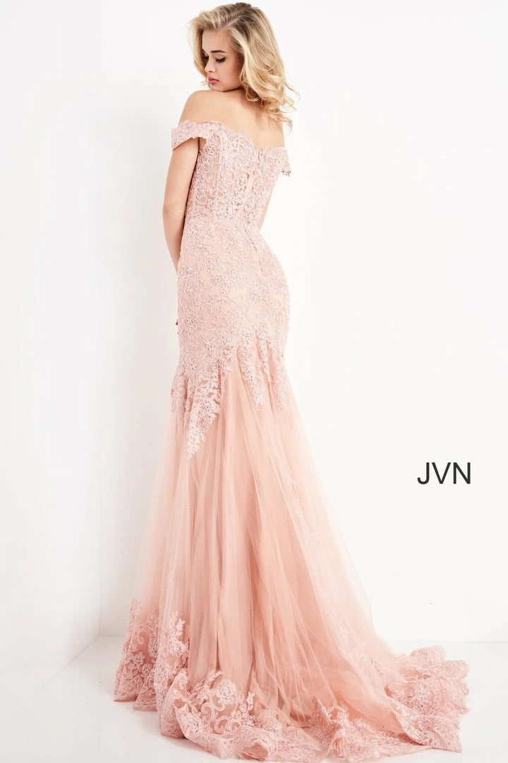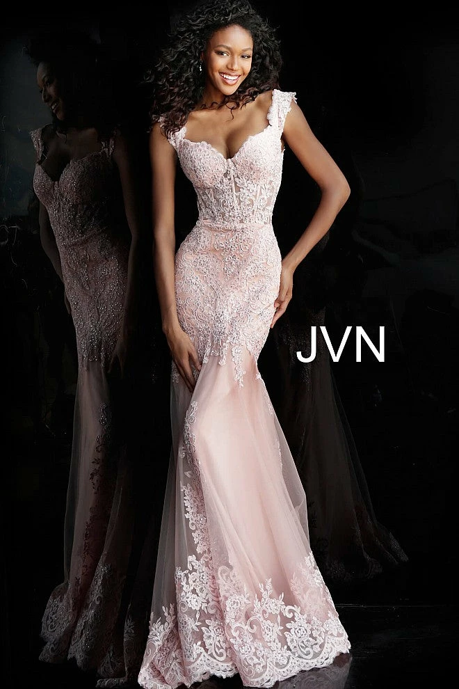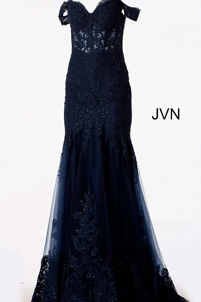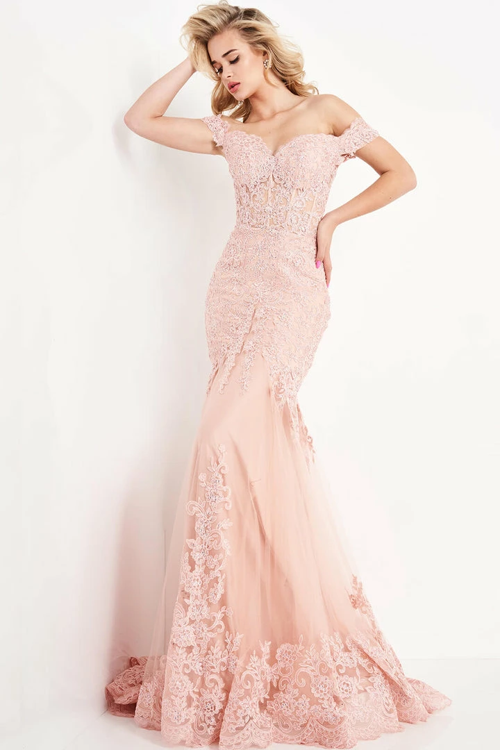 Jovani JVN65688 Prom Dress Sheer Corset with off the shoulder straps, mermaid silhouette. Sheer Corset with boning Embellished floral lace appliques cascade across the fitted bodice and features cap sleeve / Off the shoulder Scallop lace edged straps. Fit & Flare Mermaid Silhouette with a lush trumpet skirt with lace edges & train. Great romantic prom dress style. Also perfect for wedding guests & Plus Size!