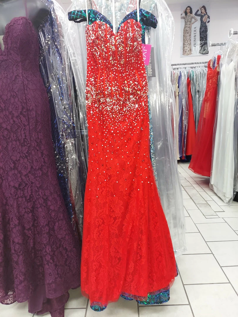 Jovani JVN92842 is a long fitted lace prom dress with a strapless neckline. Fitted corset style bodice with boning. Fully Embellished & Beaded top cascading into the lace skirt.