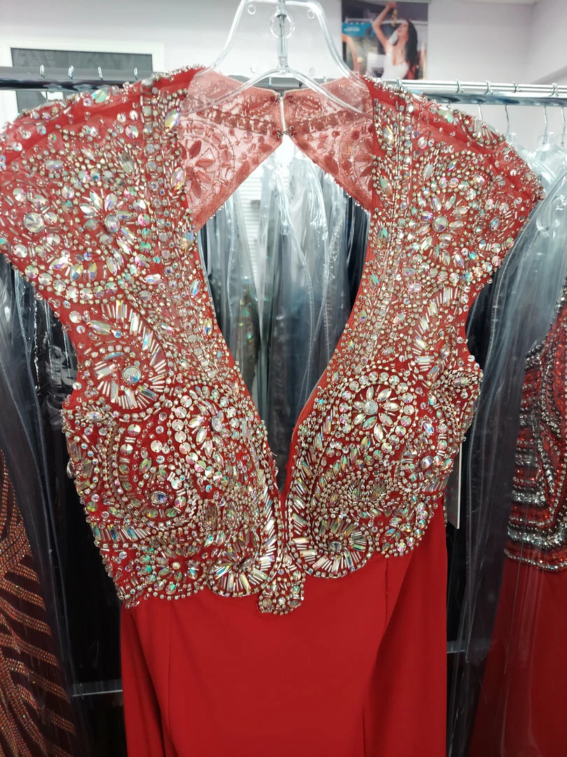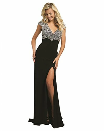 Gorgeous black fitted prom dress features iridescent crystal embellishments and a deep v-neckline. Features a slit.