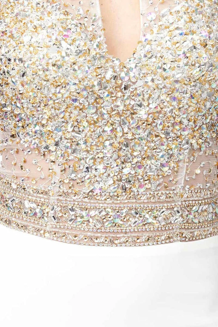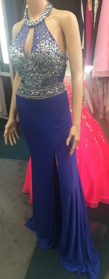 ο»ΏStunning halter form fitting dress features a sexy thigh high slit and crystal embellished bodice with a keyhole neckline