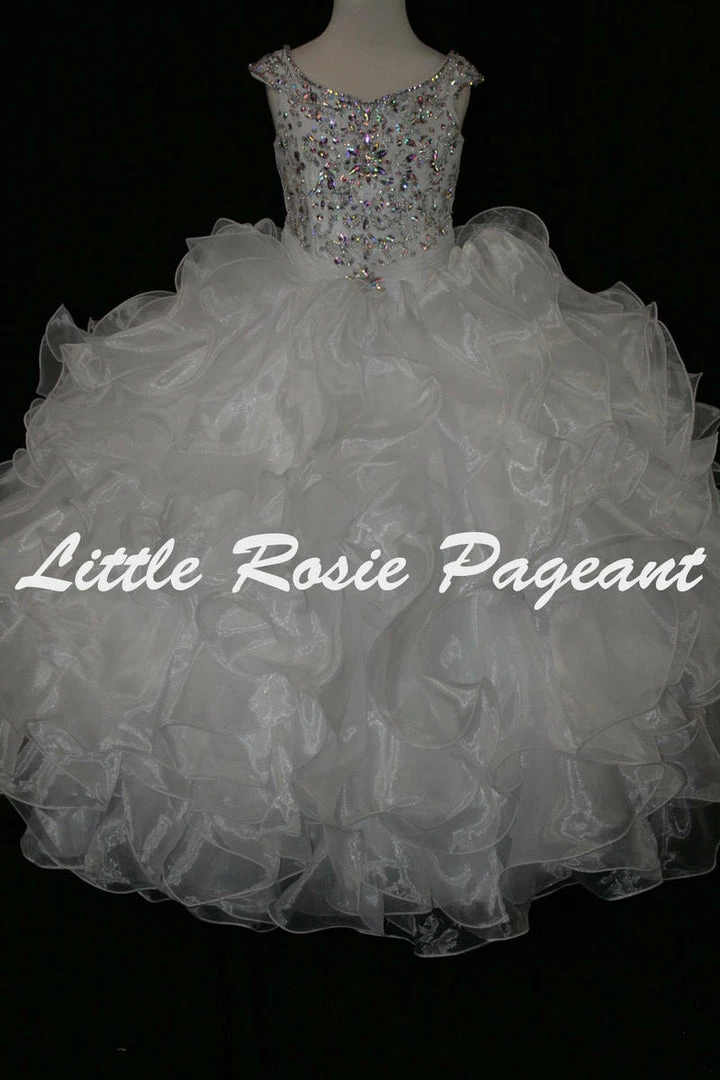 Little Rosie LR2175 – 2175 is a Girls Long Glitz Pageant Dress Featuring a Heavily Embellished AB Crystal Rhinestone Bodice and cap sleeves. sheer illusion cutout keyhole back with a corset lace up tie closure. Full organza ruffle layer skirt.