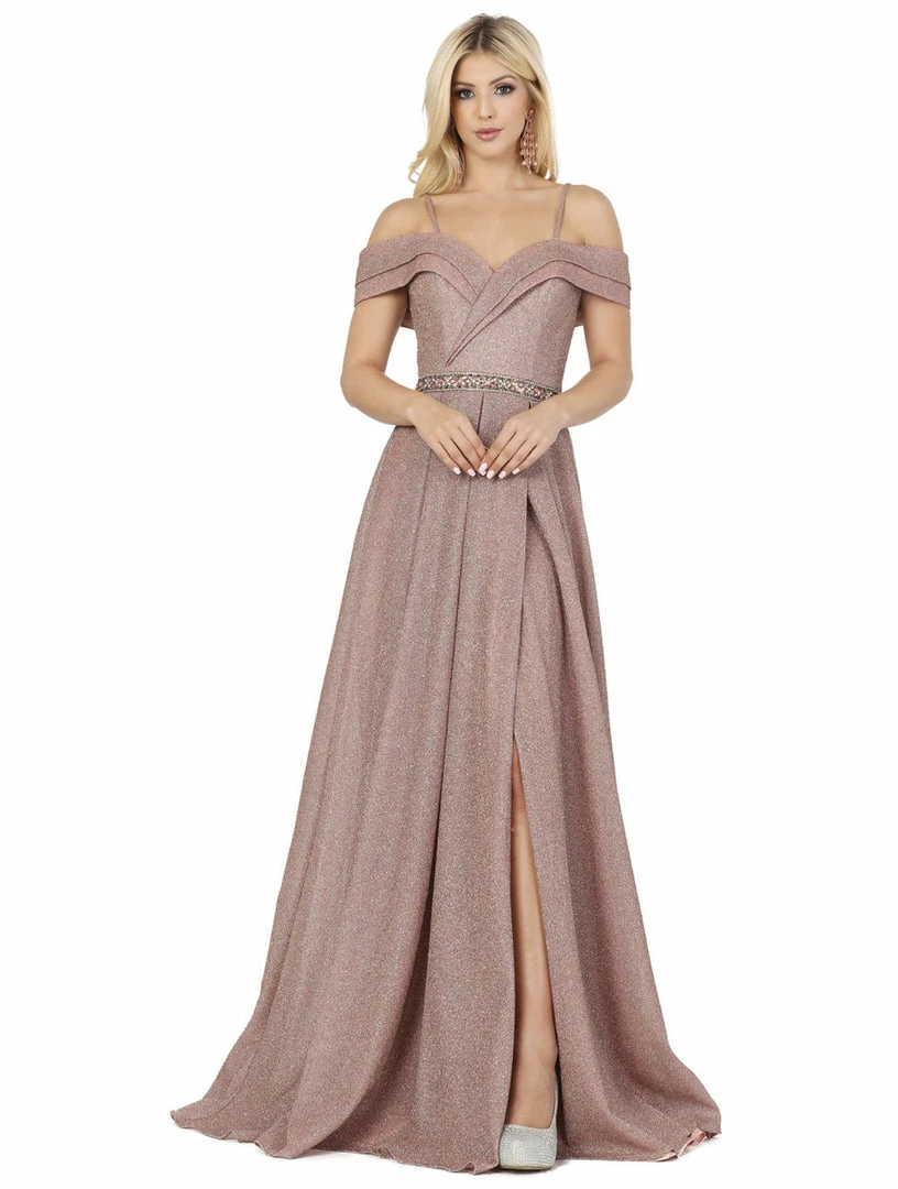 4006 Long shimmer formal evening gown with off the shoulder straps and a maxi slit. great gown for any formal event. Crystal rhinestone and beaded waist band.