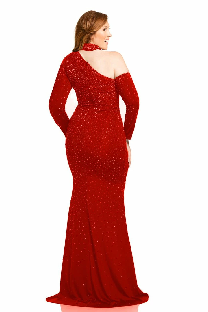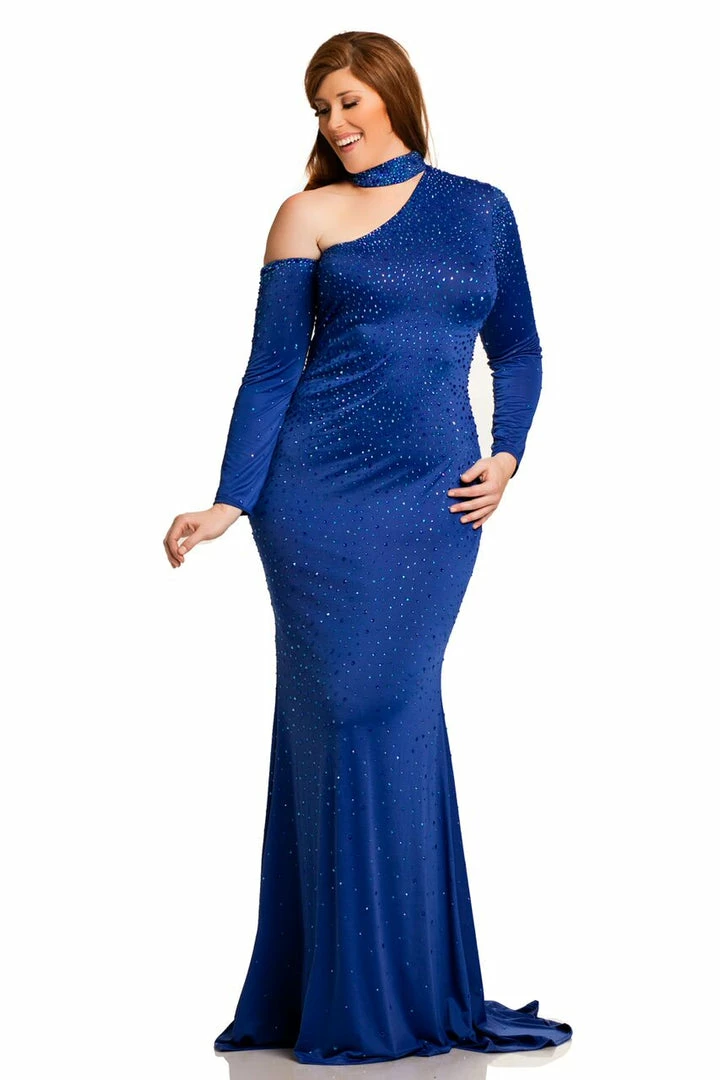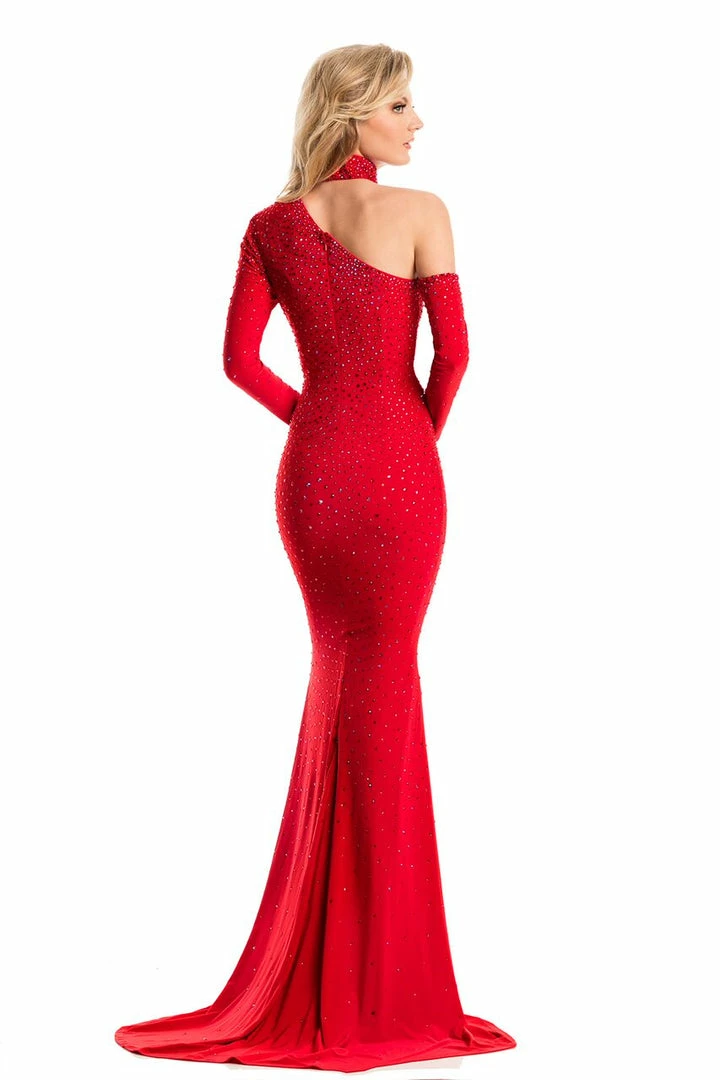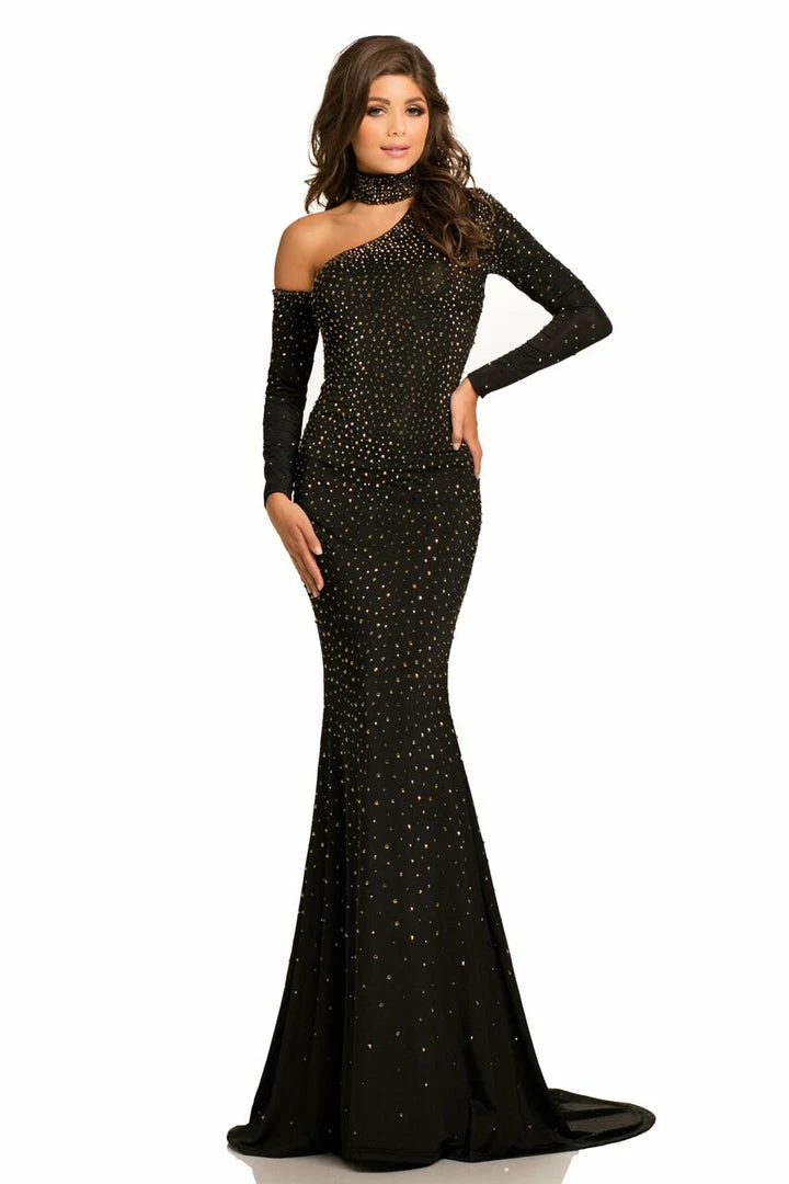 JK7215Β This dramatic long dress of stretch jersey hugs the body for a sexy sparkling silhouette embellished with crystals.Β The choker and additional sleeve are detachable.