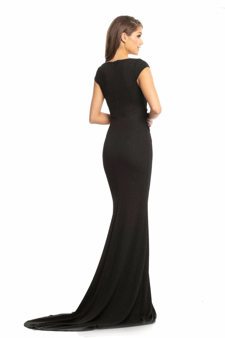 This enchanting dress from Johnathan Kayne 9043 is sure to make you the center of everyones attention. Graces in a plunging V-neckline with cap sleeves. This dress is made of stretch glitter knit and shows the bodice gathered at one side. The back has a zipper closure and the full length trumpet skirt allures in a thigh high slit and sweep train finish. Exhibit your softer side in this delightful evening gown by Johnathan Kayne. Cap sleeves, Plunging neckline, Gathered side, Back zipper, Trumpet skirt, Slit, Sweep train