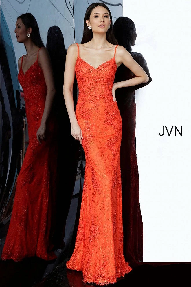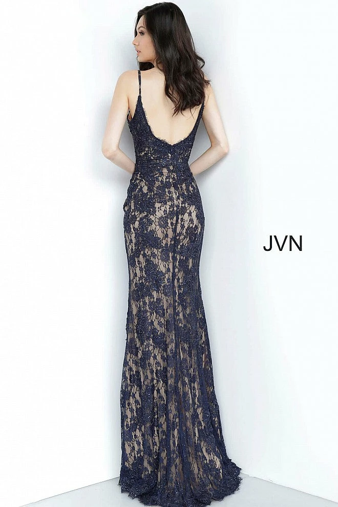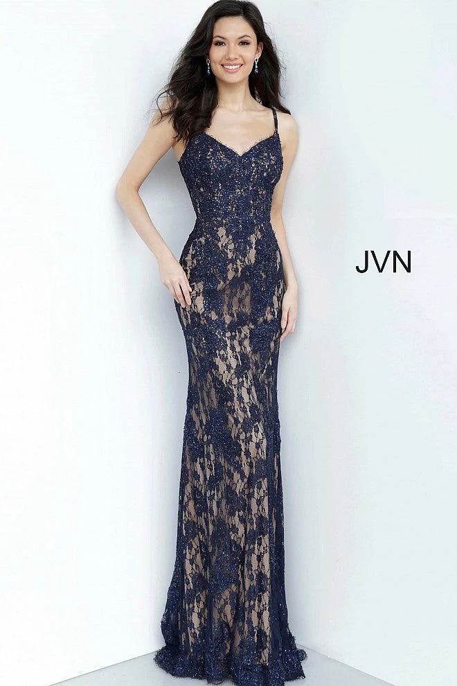 Jovani JVN02013 is a long fitted prom dress with embellished lace. Flared skirt with fitted bodice. eyelash lace along the sweetheart neckline with spaghetti straps. Absolutely stunning evening gown