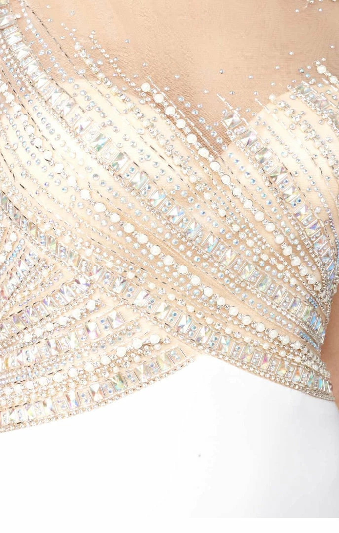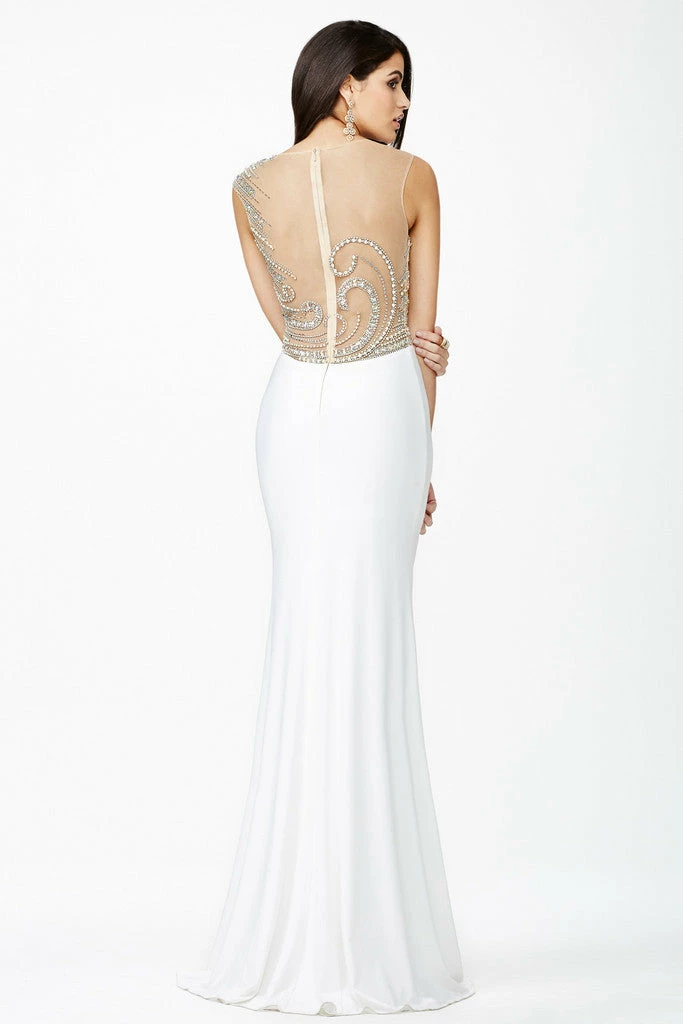 Jovani JVN23472 – JVN 23472 is a Breathtaking sleeveless jersey gown features a crystal embellished bodice and sexy thigh high slit. asymmetrical elaborate beading & Embellishments along the sheer high neck bodice.