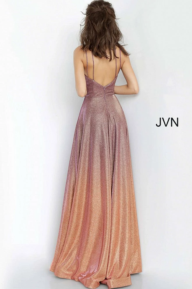 JVN4327 by Jovani is a metallic glitter prom gown with a plunging neckline, Criss Cross Glitter Strap Design with a sleeveless bodice, and cross strap open back, floor-length A-line pleated and flared skirt. Absolute Stunning color combinations with an ombre effect!