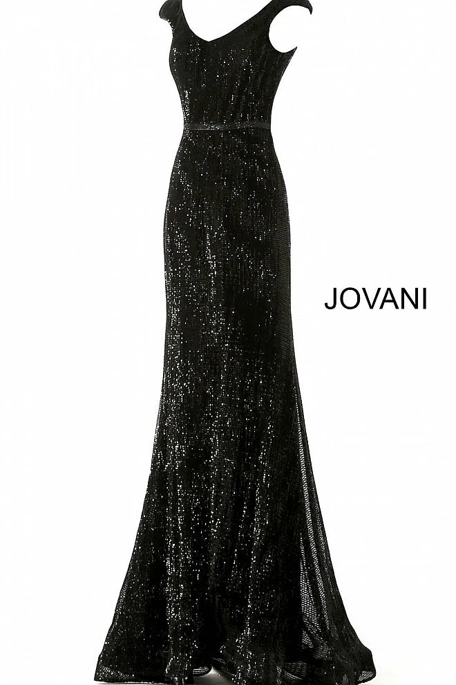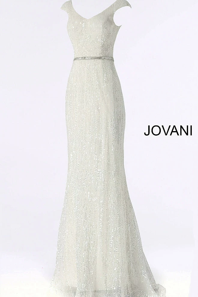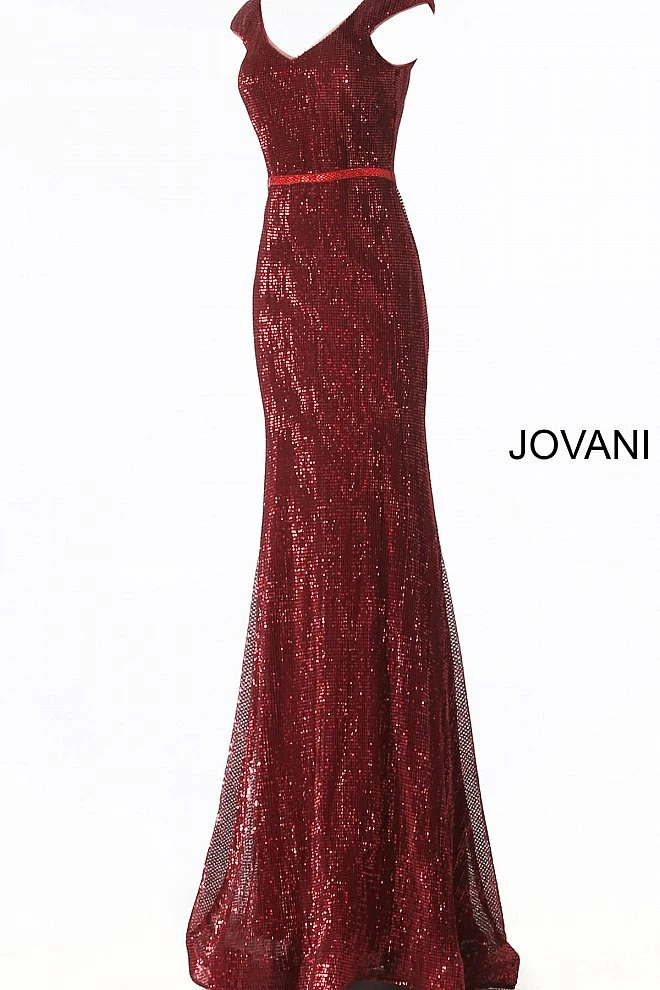 - Sequin embellished prom dressΒ with cap sleeveΒ fitted bodice, v-neckline and v-back, embellished waist belt and floor-length fitted skirt with a lightly flared end.
