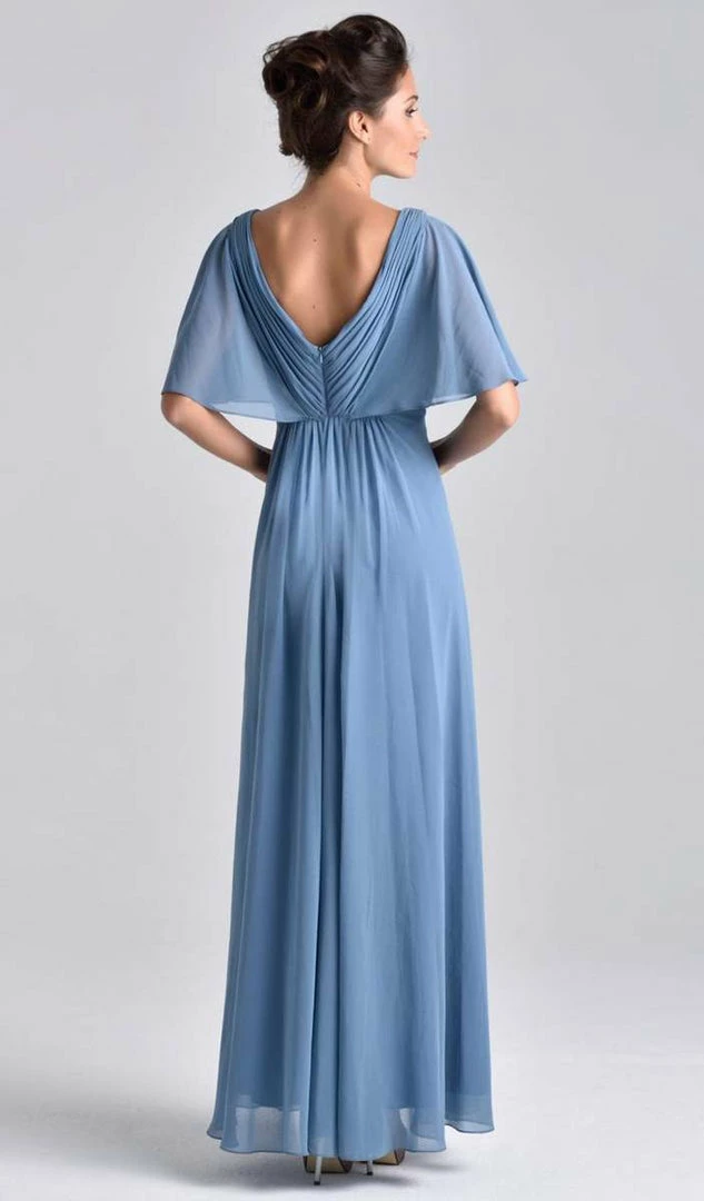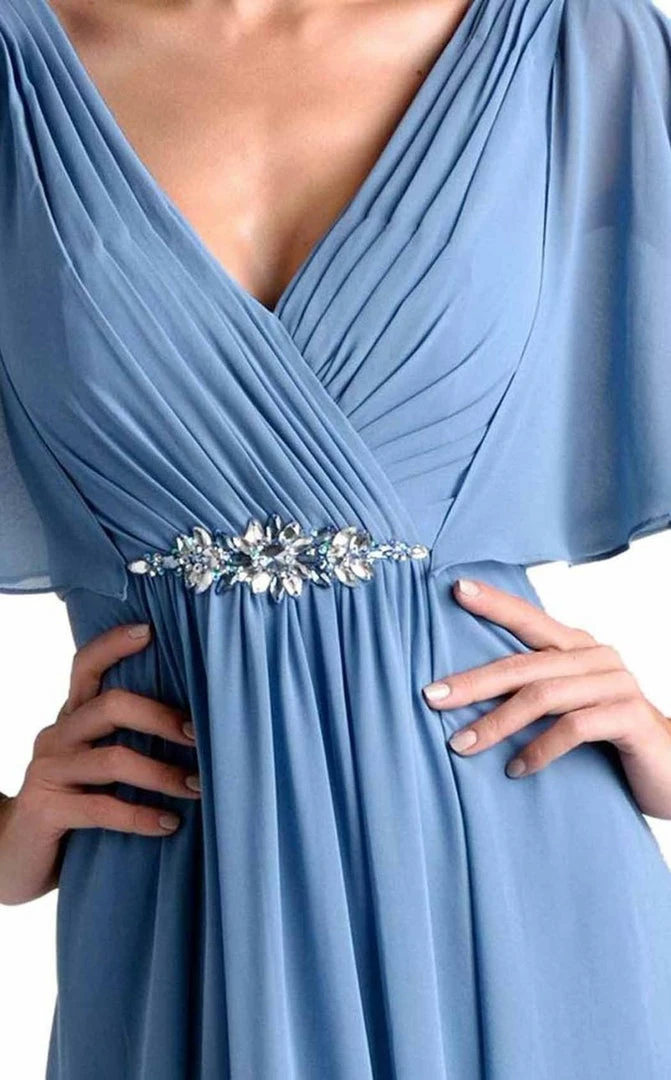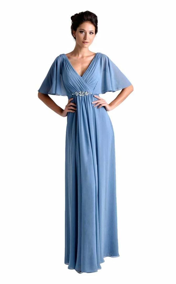 Nina Canacci M239 is a long draped chiffon long formal dress. Specialized for wedding guests & Mother of the Bride/Groom. This Mauve Ruched gown features draped chiffon sleeves for coverage & a flattering fitted waist with crystal embellishments.