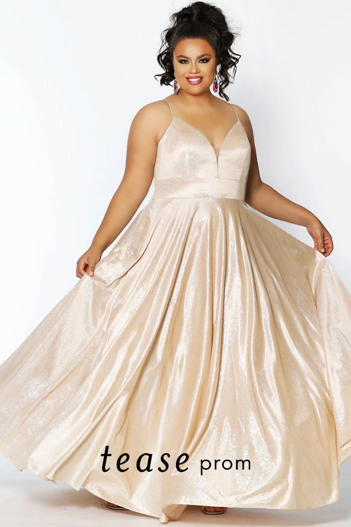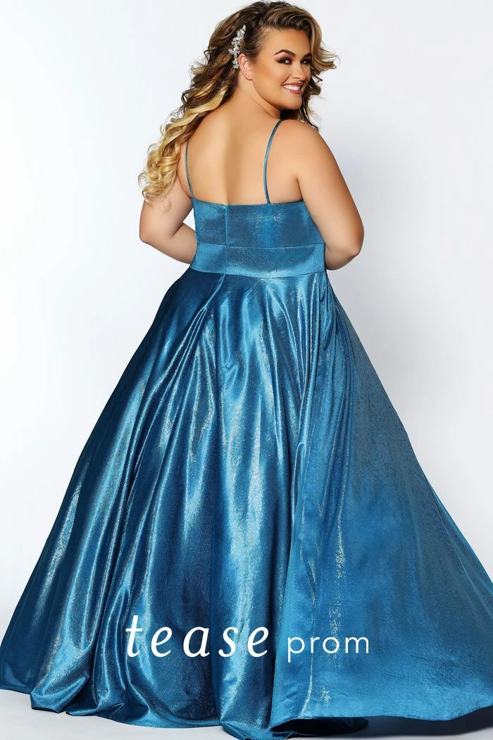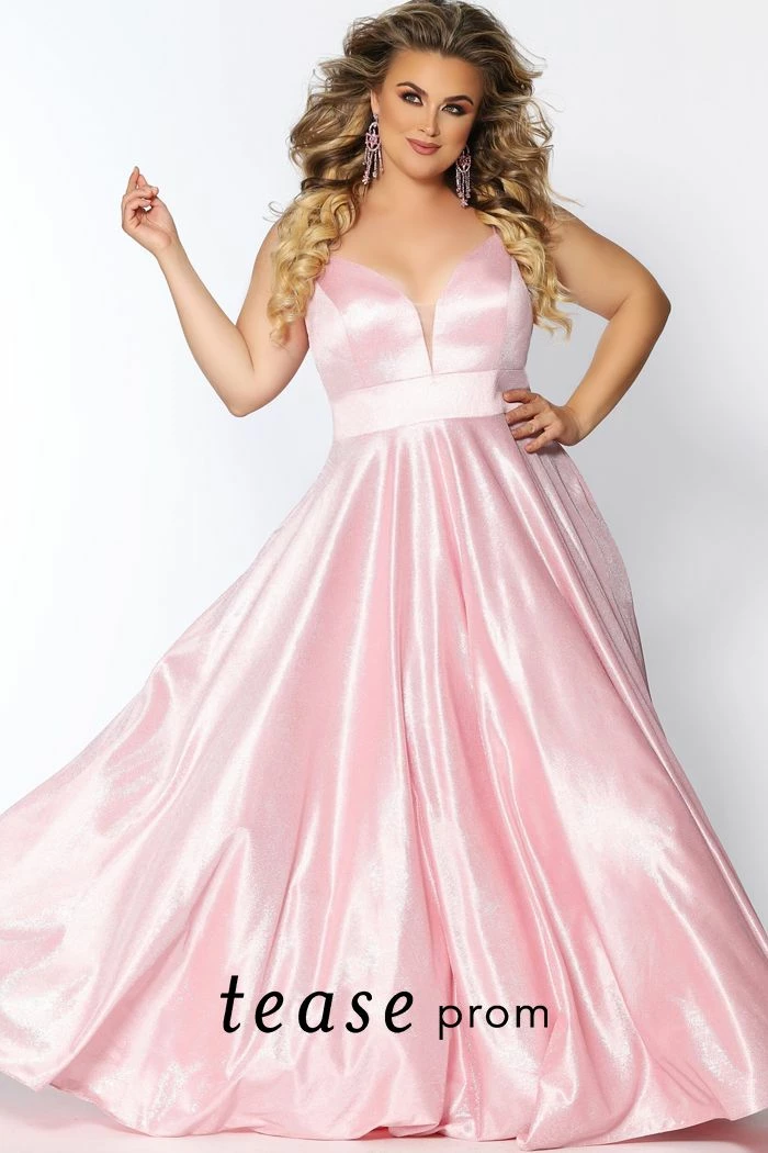 Tease Prom TE2014 a line prom dress. Bring on the sassy and sexy wearing this plus size satin knit dress. This shiny ensemble with plunging V-neckline and spaghetti straps in a glowing satin just add the spark to this dress. Full A-line skirt and natural waistline will flatter every figure type. Dress comes in three dynamic colors: Doll Pink, Electric Blue and Wild Honey.