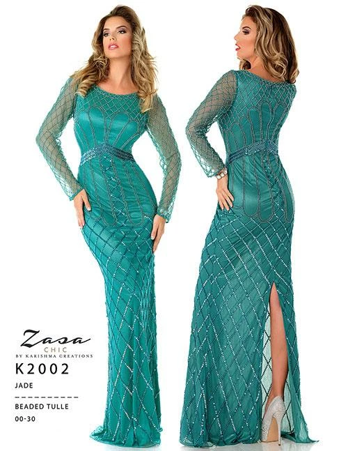Zasa Chic K 2002 is a long Fitted Embellished High neck formal gown with Sheer Beaded Long sleeves. Slit in the back adds a Classic touch. Great for any formal & Semi Formal Event.