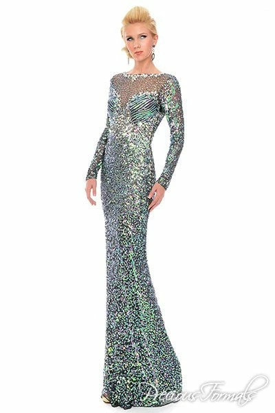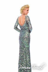 Precious Formals Lux Gal style L 9133 in Crystal Nude size 12 is a long slim fitting gown fully hand beaded with long hand beaded sleeves and scoop back. Prom Dress with sheer illusion neckline fully embellished with sequins. this pageant gown Features large AB Crystal for a wow Look