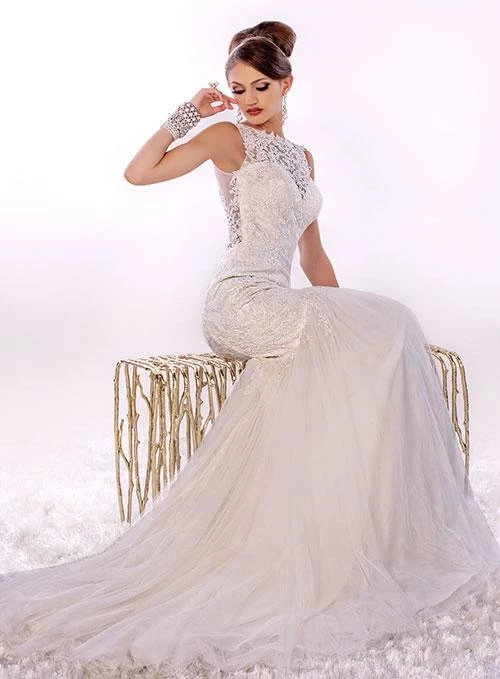 Adagio Bridal By Karishma Creations W 9269 is a stunning sheer lace high neck Wedding dress. Lush lace fitted bodice with fit & Flare mermaid silhouette. sheer lace floral applique full back with button in center. Lush soft tulle subtle trumpet skirt with sweeping train.Â