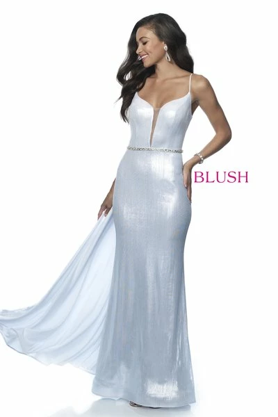 Blush Prom 11983 Liquid shimmer knit mermaid prom dress pageant gown with overskirt. Blush Prom 11983 is a 2020 Prom Dress, Pageant Gown & Formal Evening Wear. This Long Fit & Flare Metallic shimmer dress features a plunging neckline with spaghetti straps and a sheer embellished back. beaded & Embellished waist belt. Flowing over skirt. Great Informal Wedding Dress & Bridal Gown