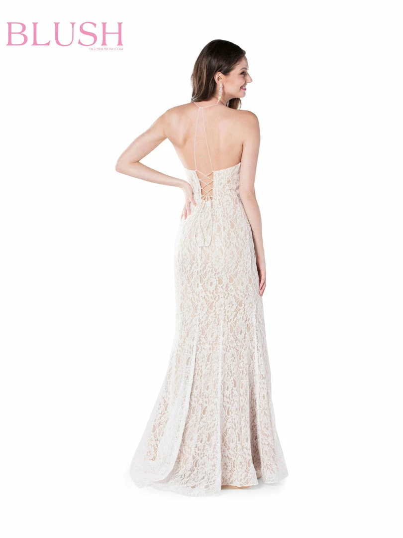 Blush Prom Dress 11853 Is a Long Sequin Embellished Prom Dress with a sheer Illusion Lace High Neckline with halter straps leading to an open corset back. slight mermaid silhouette adds glam to this Gown!