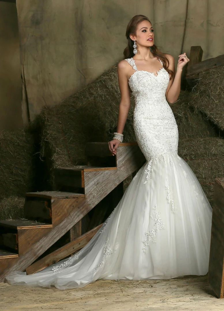 Davinci Bridal 50330 Lace & Tulle Mermaid Wedding Dress features a Fitted Beaded Lace Bodice with Sweetheart Neckline & Tapered Beaded Lace Straps. Low Scoop Back is Sheer Tulle with Lace Applique & Covered Buttons. Gathered Tulle Mermaid Skirt with Lace Applique Flares from the Knee into a Chapel Train. Trumpet skirt with train. Wedding dress – Bridal Gown – Immediate Delivery on In Stock Gowns! Fabric: Lace, Tulle, Neckline: Straps, Sweetheart, Silhouette: Fit And Flare, Mermaid, Sheath, Details: Beading, Buttons, Chapel Train, Lace, Lace Applique, Sequin Accent, Sheer Back, Zipper