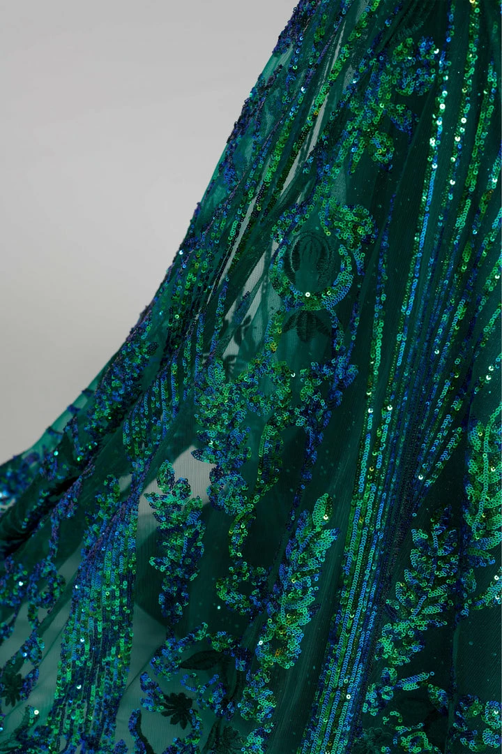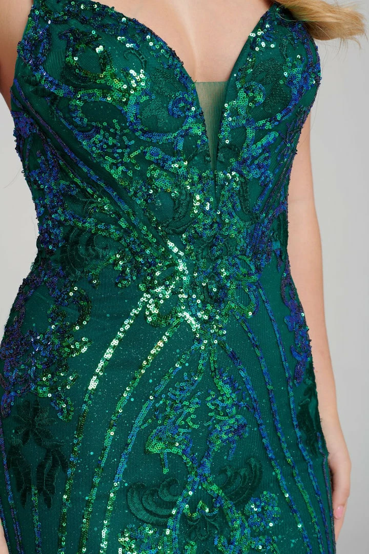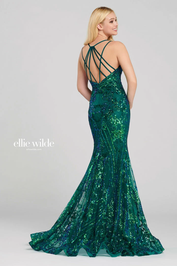 Ellie Wilde EW120028 – EW 120028 Sleeveless sequin lace fit and flare gown with a plunging V-neck, natural waist, criss cross back, horsehair hem and a sweep train. Glittering V-neckline evening gown by Ellie Wilde