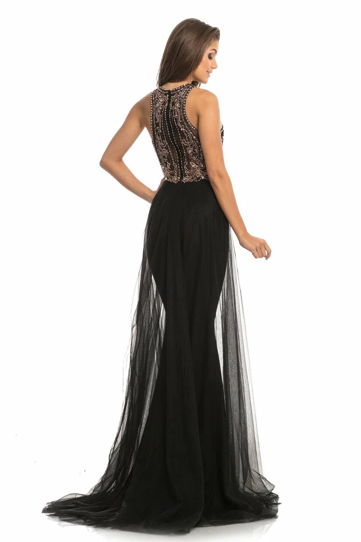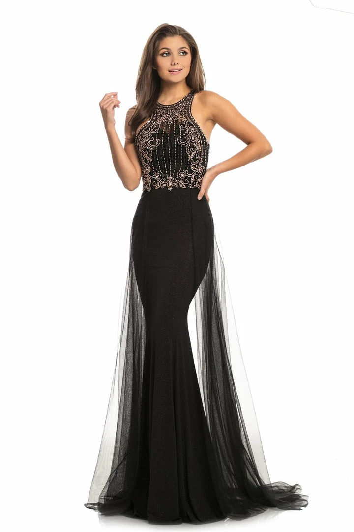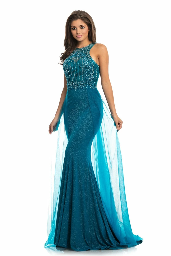 Johnathan Kayne 9071 This Pageant Dress Features a sheer illusion high neck and razorback bodice of this sparkling Fitted jersey gown offers excellent support. The mermaid skirt falls over the hip and is framed by the dramatic mesh hostess overskirt that flows around the body with a sweeping train  Long Iridescent Pageant Dress Overskirt Mermaid Gown
