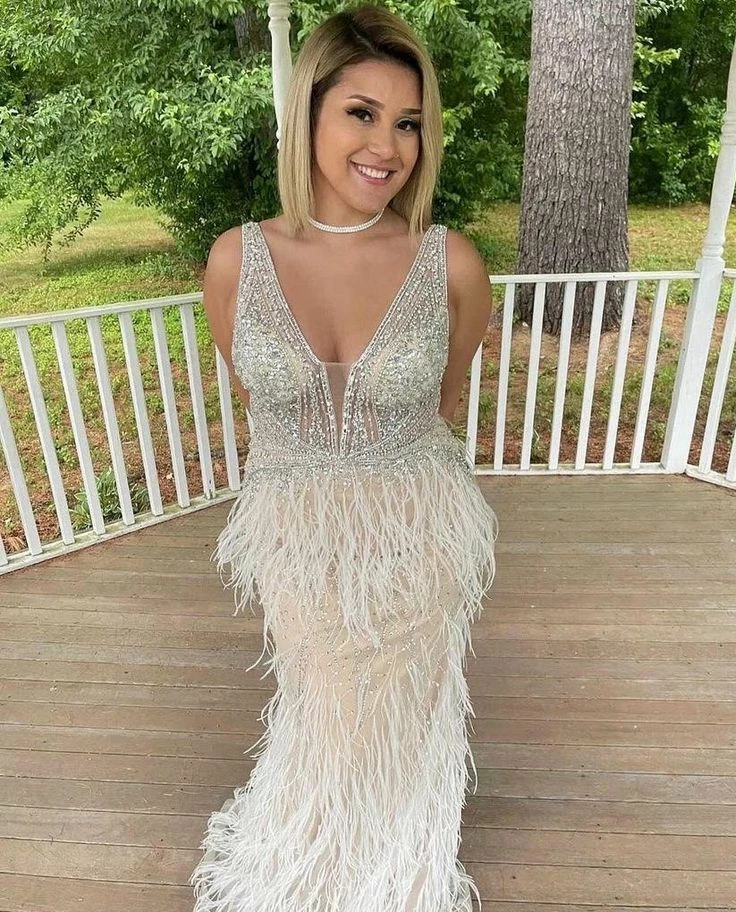 Jovani 03023 is a Long Feather Prom Dress, Pageant Gown, Wedding Dress & Formal Evening wear. This Sheer embellished bodice features a plunging v neckline with beading & crystal accents cascading through a feather embellished skirt. Very stunning and unique wedding dress!Â