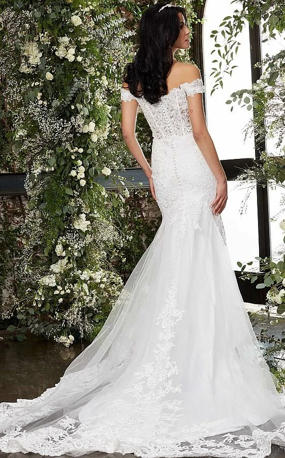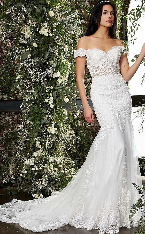 Jovani Bridal JB07161 Lace Sheer Corset off the shoulder Wedding Dress Fit & Flare Gown sweetheart neckline with scalloped lace trim and sweeping train.