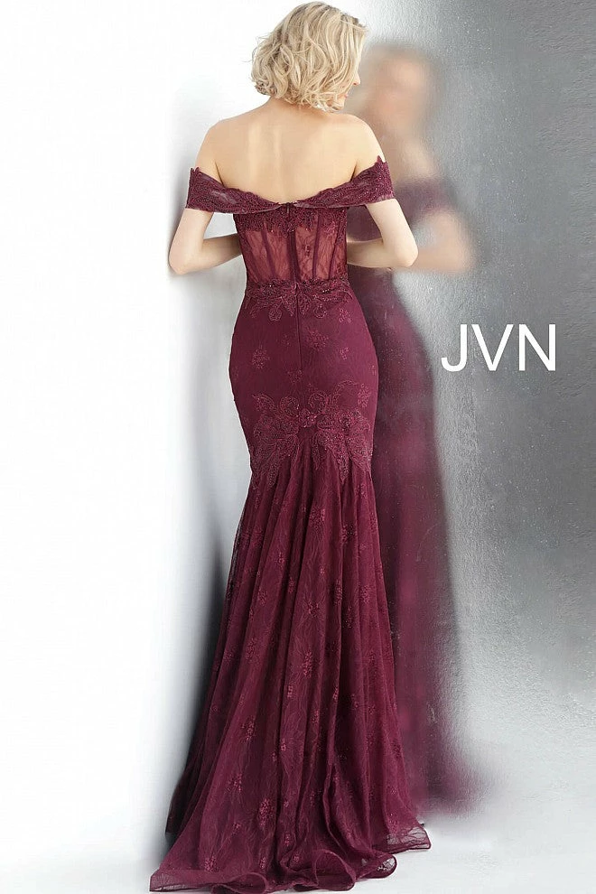 Jovani JVN66981 is a lace Prom Dress, Pageant Gown & Formal Evening Wear. Sheer Lace Corset Embellished with crystal rhinestones. Luxurious Princess style off the shoulder straps. Floral Lace Applique Cascading along the fit & Flare Mermaid silhouette with a lush trumpet skirt and train. absolutely stunning formal event evening gown.  Great wedding Guest Dress of Mother of the Bride / Groom! Perfect for Plus size