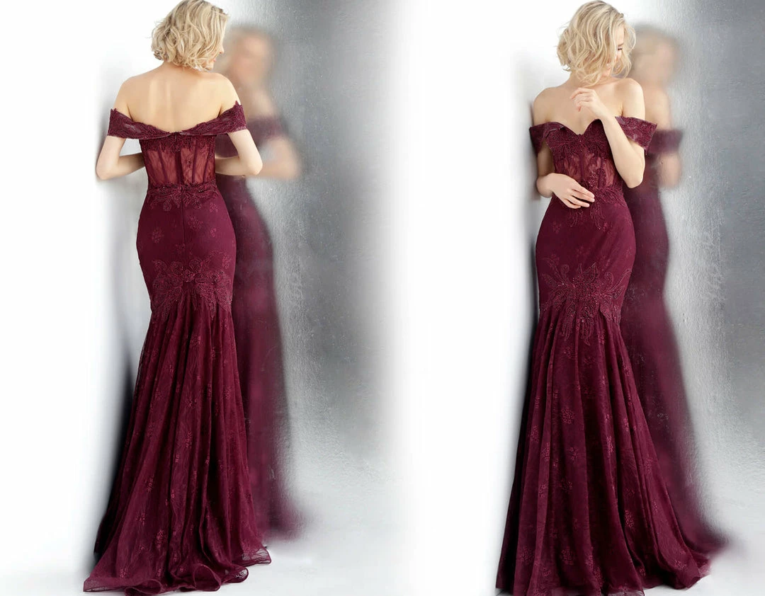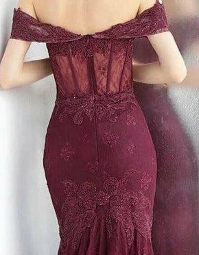 - Details:Â Bordeaux embroidered and embellished prom dress with an off-the-shoulder sheer corset bodice, sweetheart neckline and sheer back, floor-length fitted skirt with a pleated end and sweeping train.