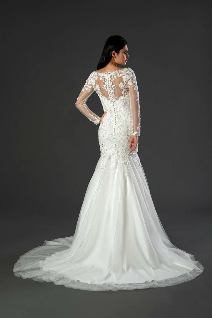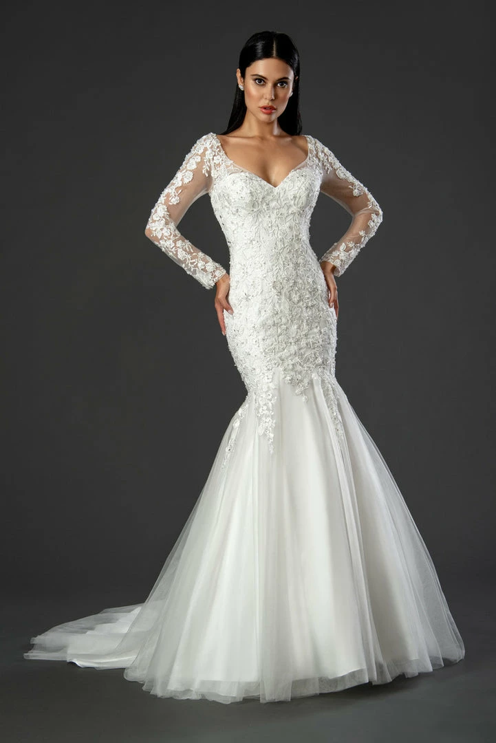 Stella Couture 21090 Long Sleeve Sheer lace Mermaid Wedding dress with v neckline and sequin & beaded embellishments. This Bridal Gown Features a sheer lace high back with an illusion sweetheart neckline. Sweeping tulle train.