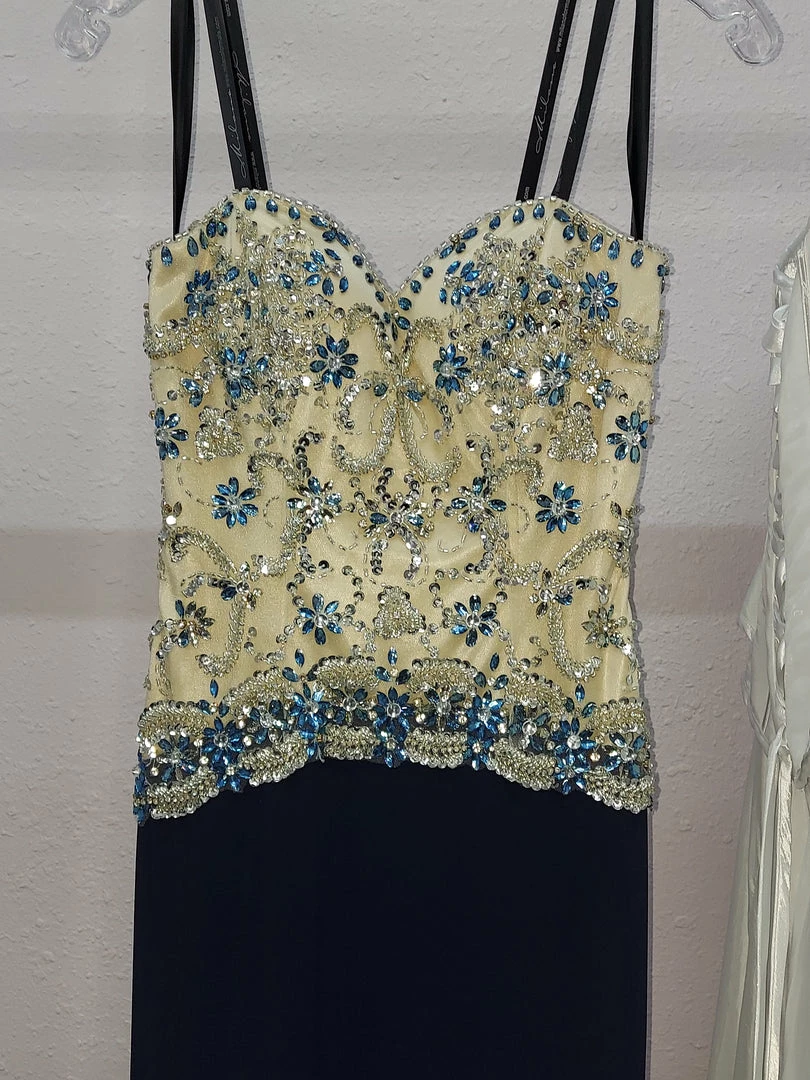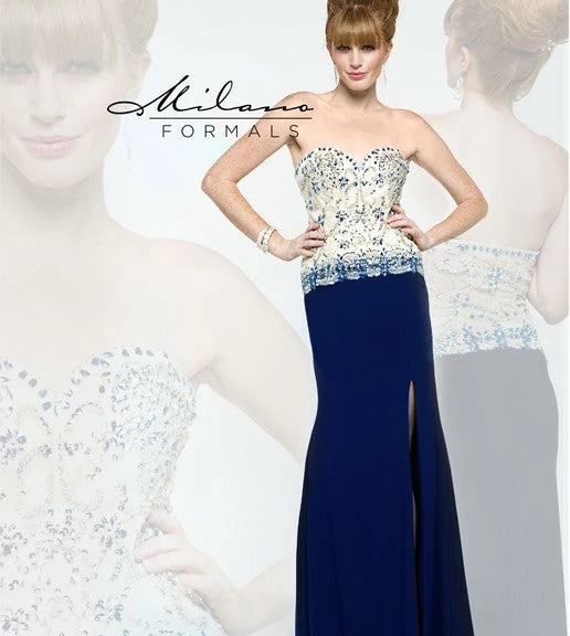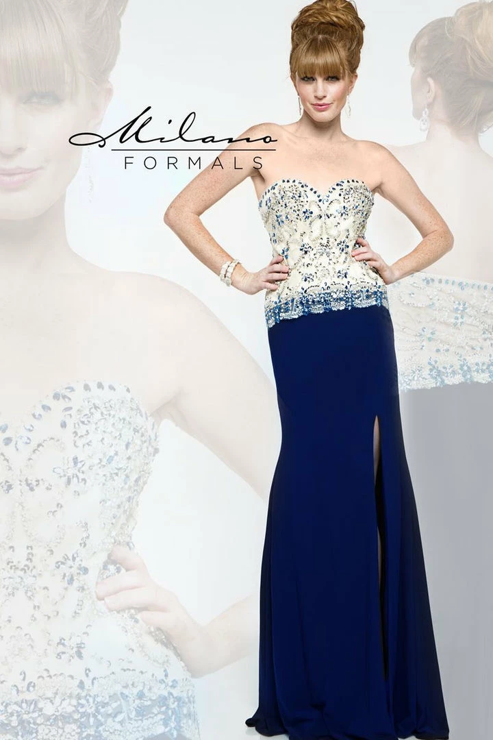 Milano Formals E 1850Â Long fitted jersey formal evening gown. Nude crystal embellished strapless bodice. Beaded sweetheart prom dress with slit in the skirt.