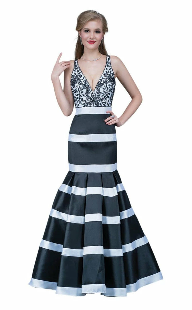 Nina Canacci 1359 This is a long fit and flare mermaid prom dress with embellished bodice and print skirt with horizontal bold contrasting stripes. The long fit and flare skirt on this evening gown is pleated adding fullness to the dress. It has a v back with a cutout.