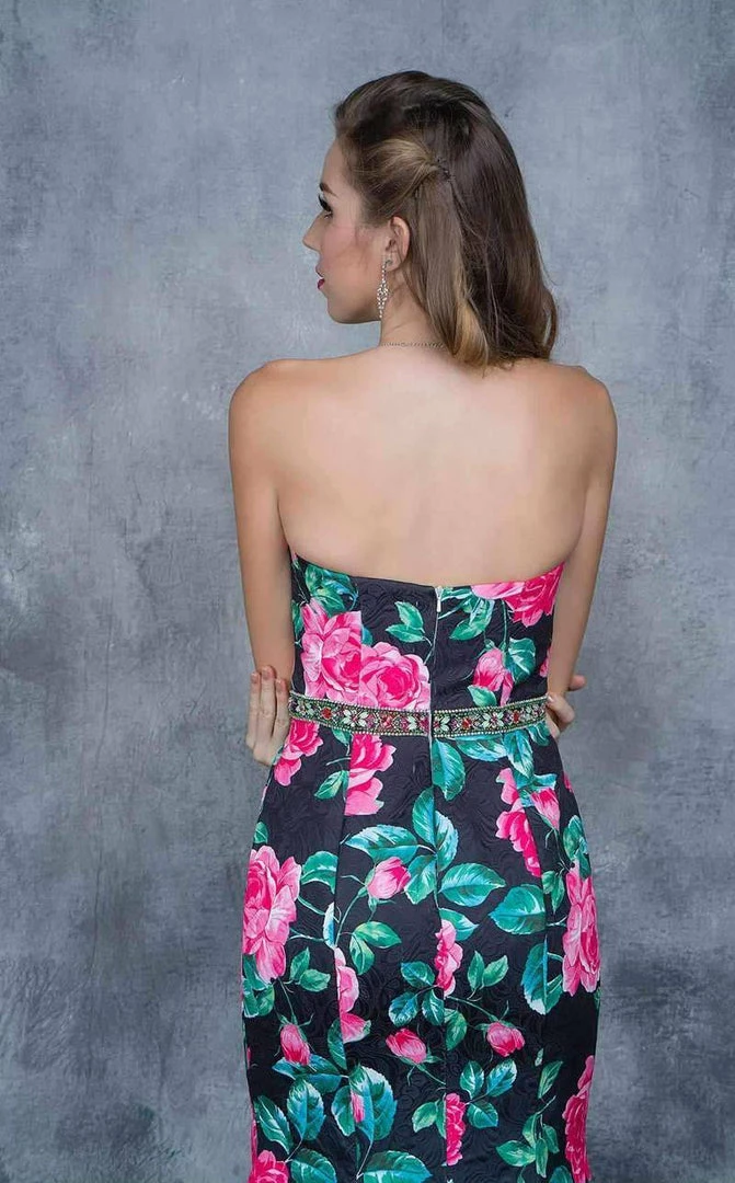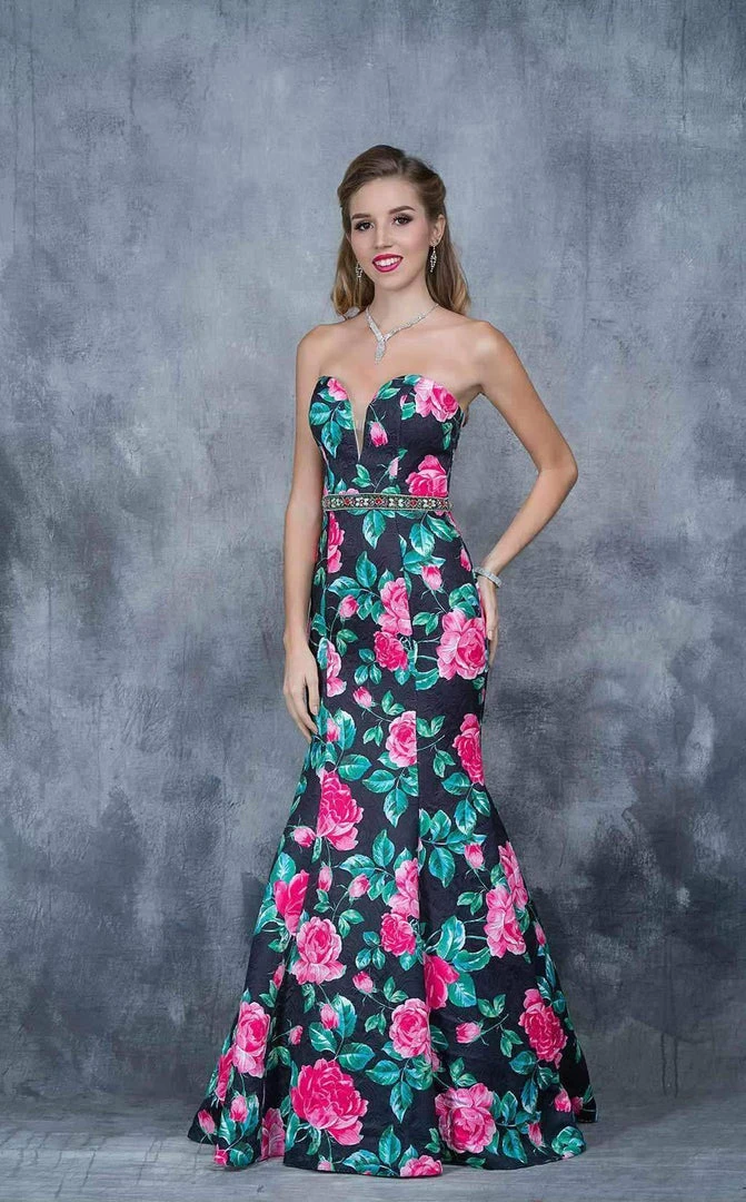 Nina Canacci 1362 This is a strapless floral print long mermaid prom dress with a plunging neckline and illusion panel with an embellished waistline. Great for spring formal dance, prom or other special events.