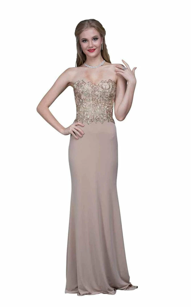 Nina Canacci 2117Â The strapless, sweetheart neckline features decorative edging and a finely fashioned fit along bust and midriff. A sheer layer atop contrasting lining creates a translucent effect, and floral designs provide blossoming accents. The contrasting skirt sluices from a dropped waist to a wash of flutters from knees to feet. Sheer embroidered lace corset style bodice with boning.
