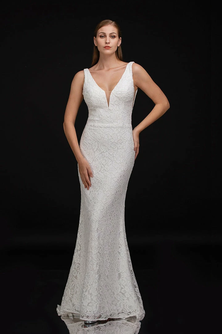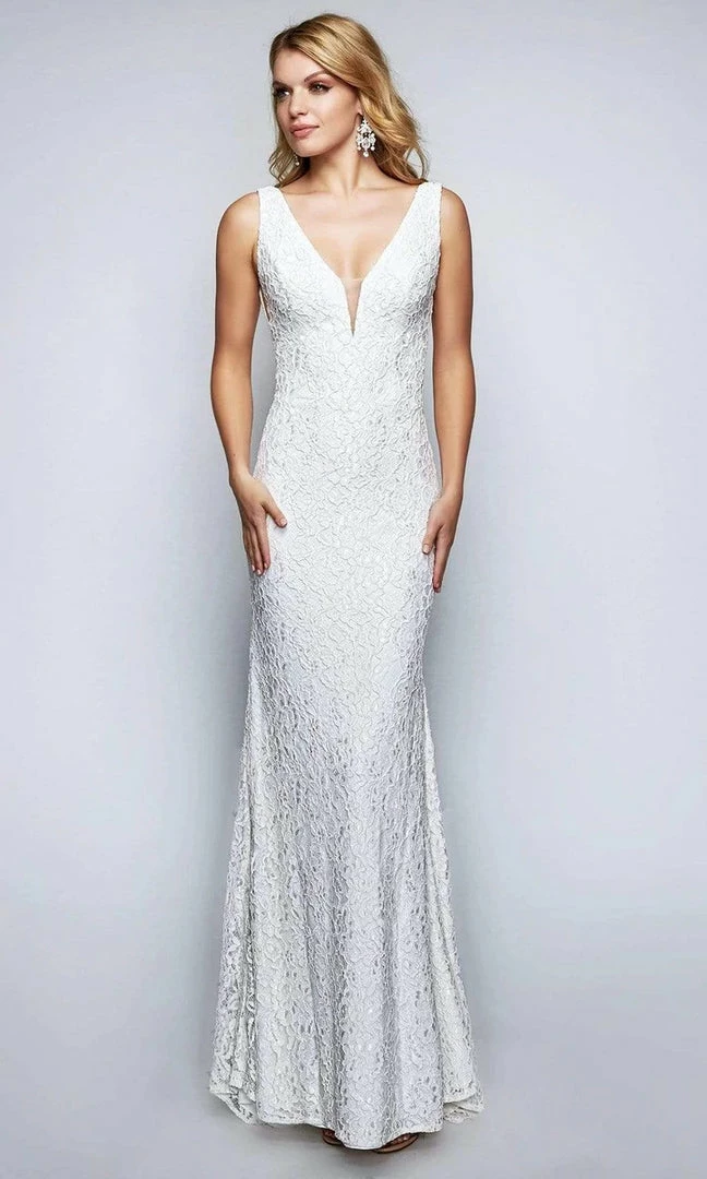 Nina Canacci 2229 is a Long Fitted solid Ivory Lace formal destination wedding dress, pageant gown & informal Bridal. Featuring a plunging V Neckline and open V Back. small sweeping train. Destination Lace Wedding Dress Open Back V Neck